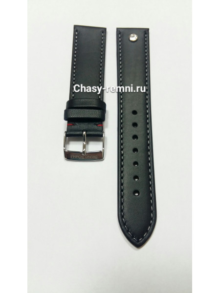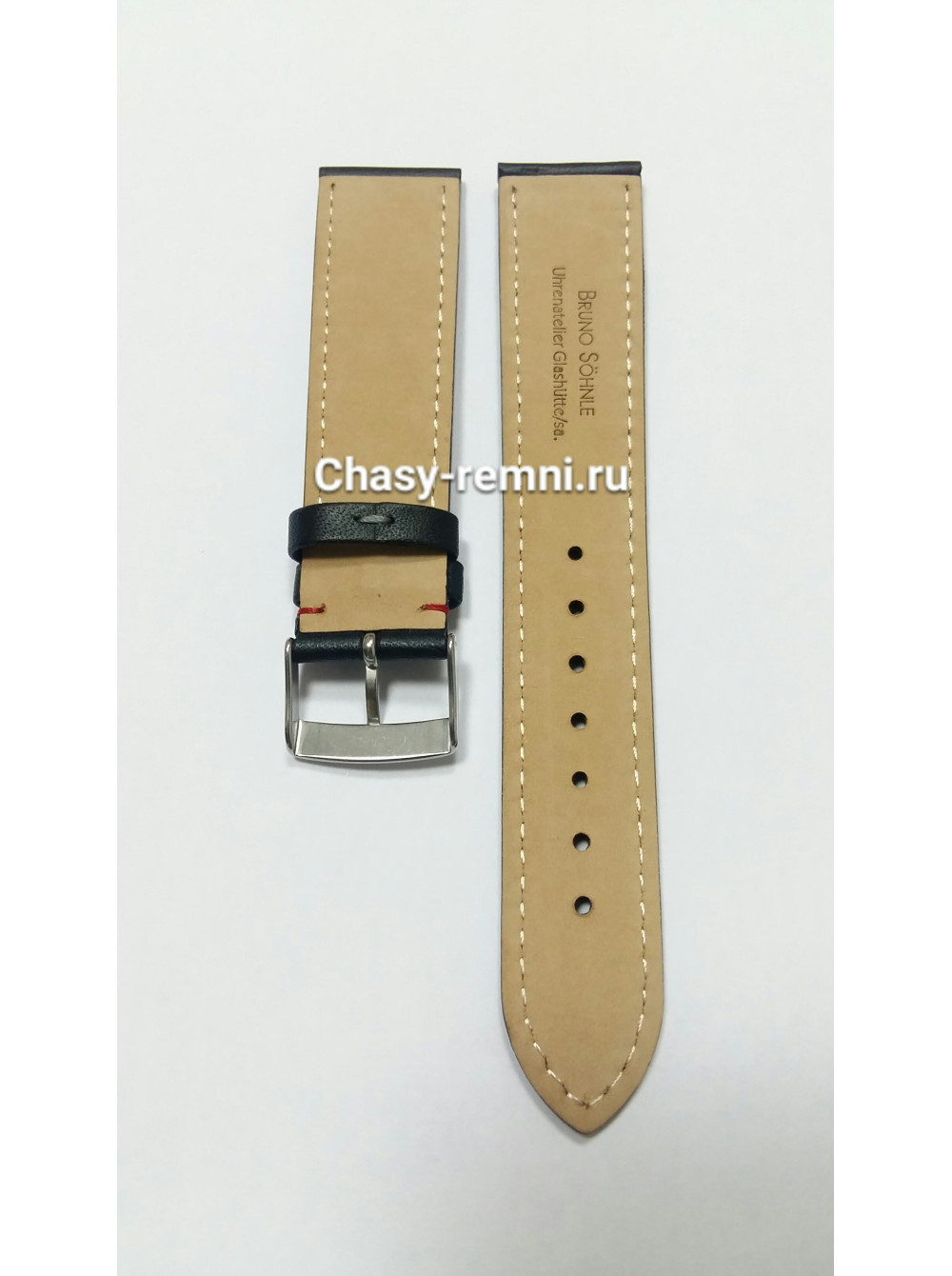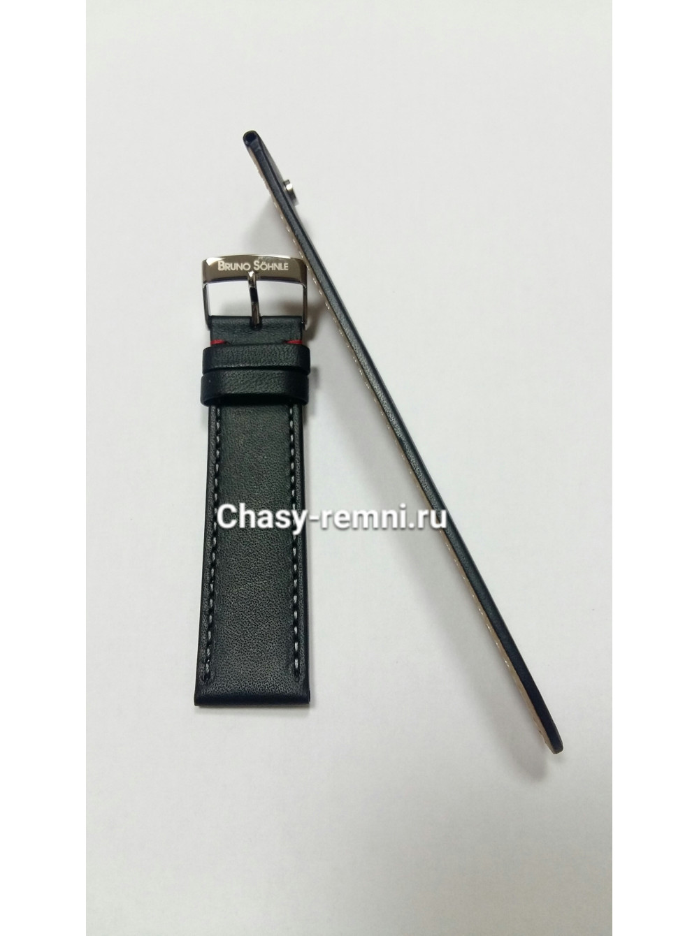 Оригинальный кожаный черный ремешок BRUNO SOHNLE, гладкий, с серой прострочкой, со стальным логотипом, со стальной пряжкой. Длинна ремешка 75*120 мм. Размер входящий в корпус и на пряжку 20/18 мм.
