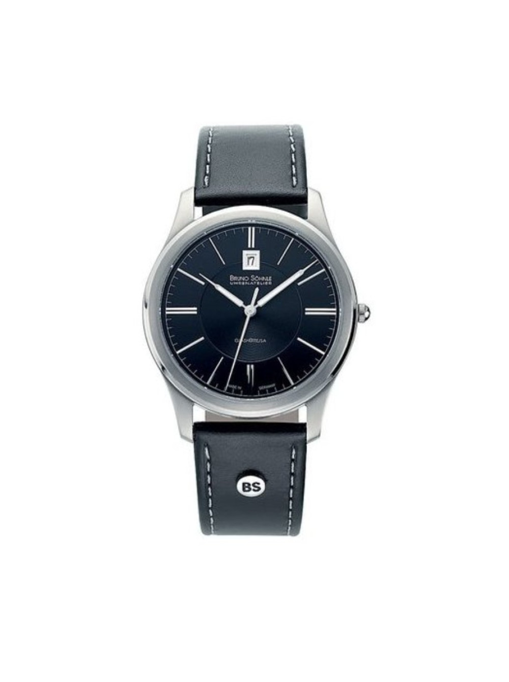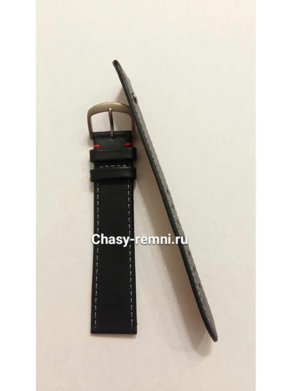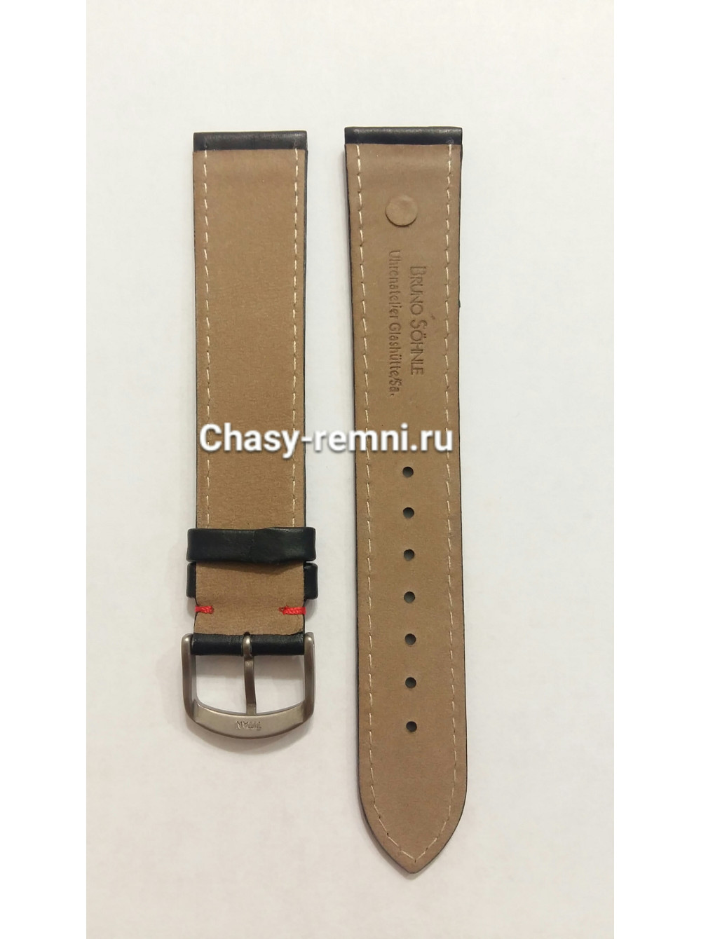 Оригинальный кожаный черный ремешок Bruno Sohnle, гладкий, удлиненный с серой прострочкой с титановой пряжкой. Длина ремешка 90*120 мм. Размер входящий в корпус и на пряжку 20/18 мм.