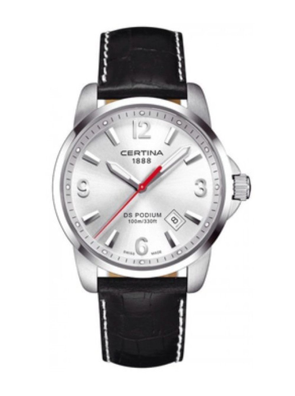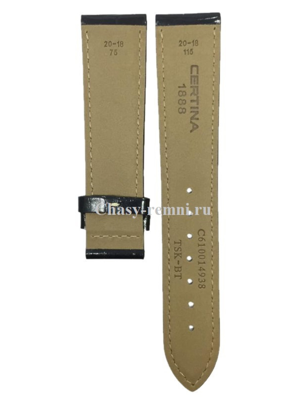 Оригинальный черный, кожаный ремешок CERTINA, имитация крокодила, белая прострочка, без клипсы. DS PODIUM. Размер входящий в корпус и на клипсу 20/18 мм. Длина ремешка 75*115 мм.