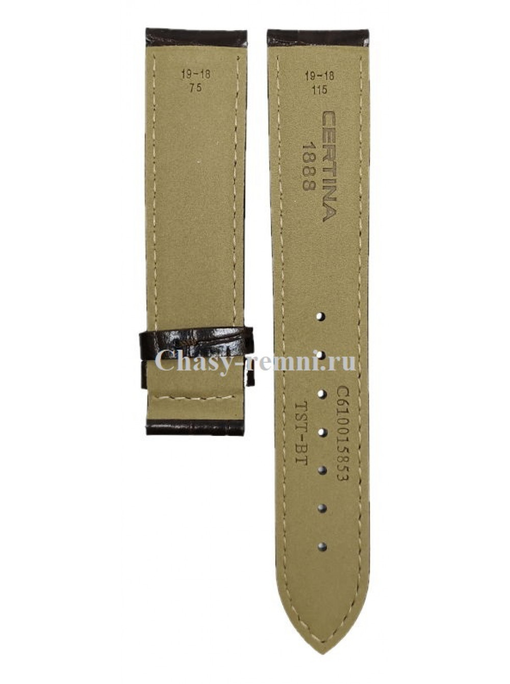Оригинальный темно-коричневый, кожаный ремешок CERTINA, имитация крокодила, без клипсы. DS PODIUM. Размер ремешка входящий в корпус и на клипсу 19/18 мм. Длина ремешка 75*115 мм.
