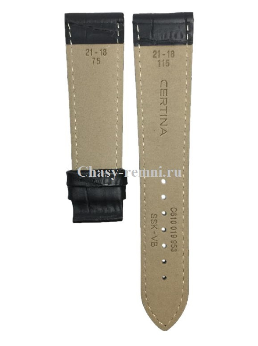 Оригинальный черный, кожаный ремешок CERTINA, имитация крокодила, без клипсы. DS-8. Размер ремешка входящий в корпус и на клипсу 21/18 мм. Длина ремешка 75*115 мм.