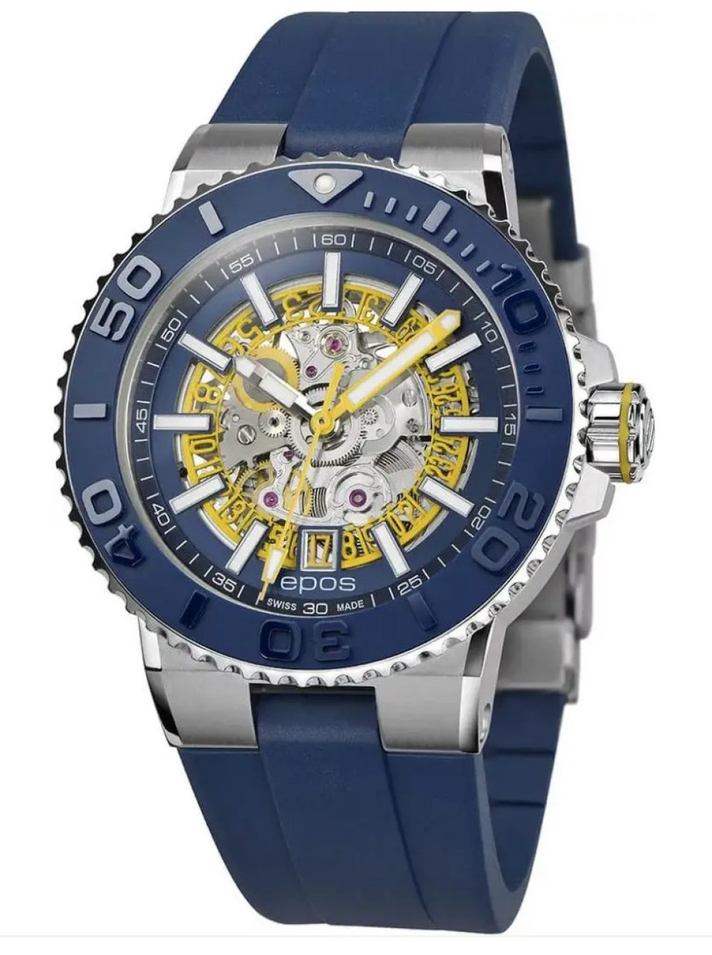 Оригинальный синий, каучуковый ремешок EPOS, интегрированный под корпус, без клипсы. Размер входящий в корпус 10 мм. Ширина ремешка 24/20 мм.