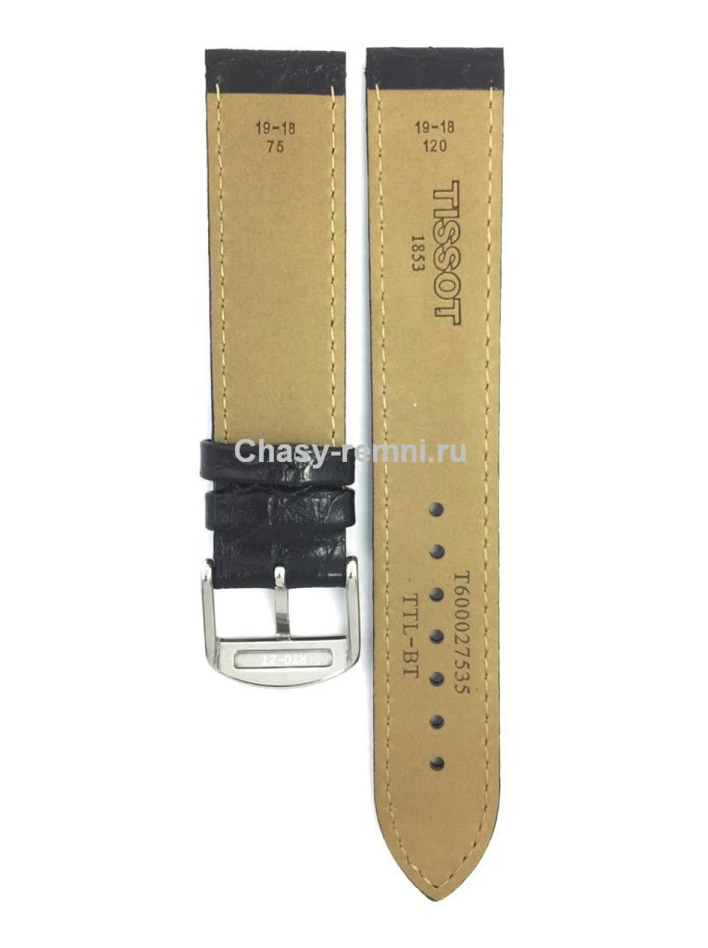 Оригинальный кожаный, черный ремешок TISSOT, имитация крокодила, стальная пряжка, CLASSIC DREAM. Размер входящий в корпус и на пряжку 19/18 мм. Длина ремешка 75*120 мм.