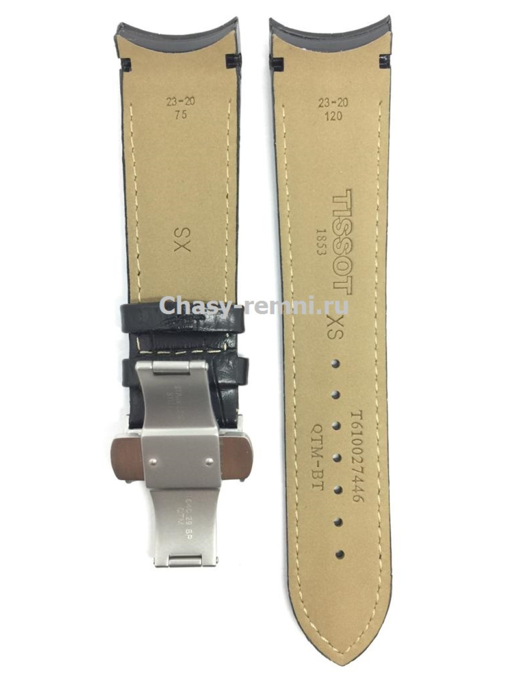 Оригинальный кожаный, черный ремешок TISSOT, имитация крокодила, интегрированный под корпус, стальная клипса. Размер входящий в корпус и на клипсу 23/20 мм. Длина ремешка 75*120 мм.