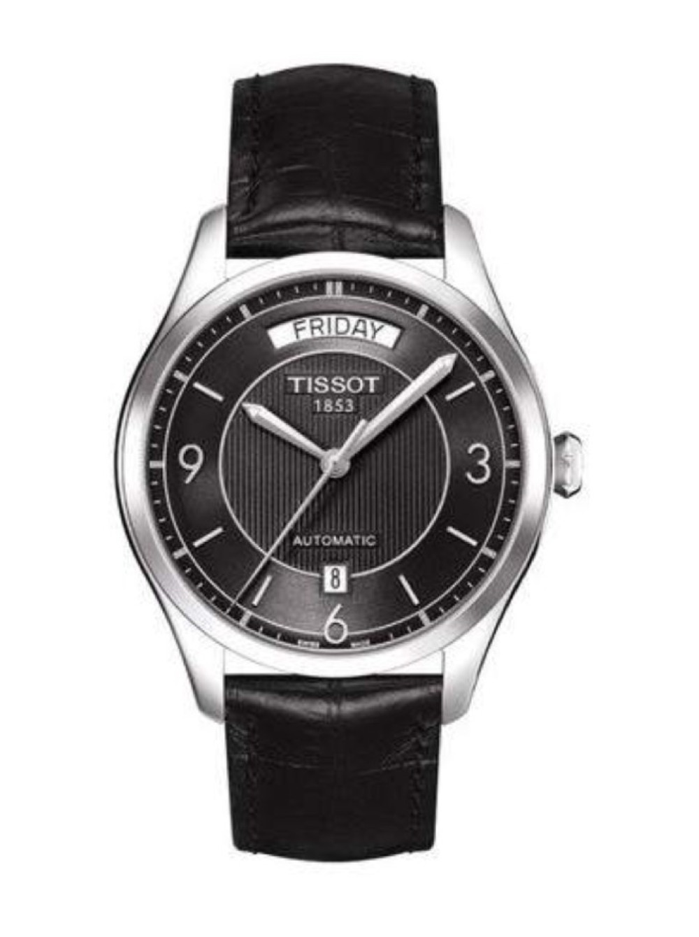 Оригинальный кожаный, черный ремешок TISSOT, имитация крокодила, стальная пряжка, T-ONE. Размер входящий в корпус и на пряжку 19/18 мм.