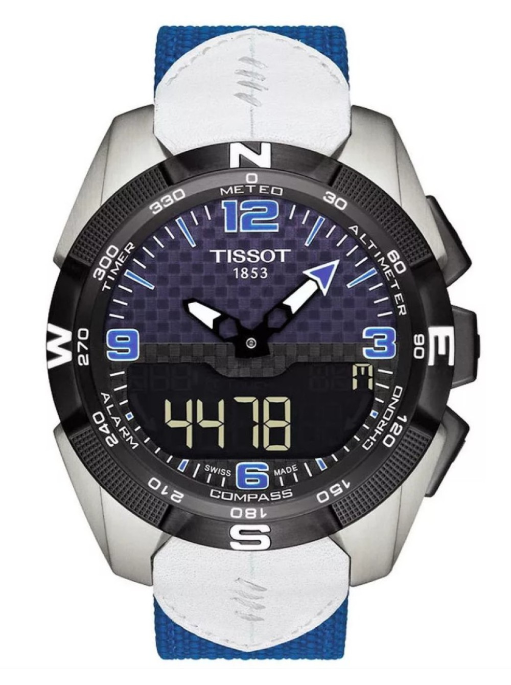 Оригинальный белый/синий, текстильный ремешок TISSOT, интегрированный под корпус, синтетика с кожей, стальная пряжка, T-TOUCH SOLAR. Размер входящий в корпус и на пряжку 22/20 мм.