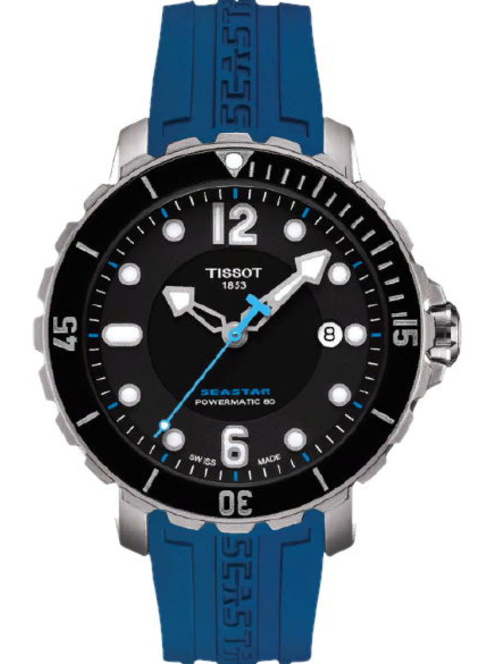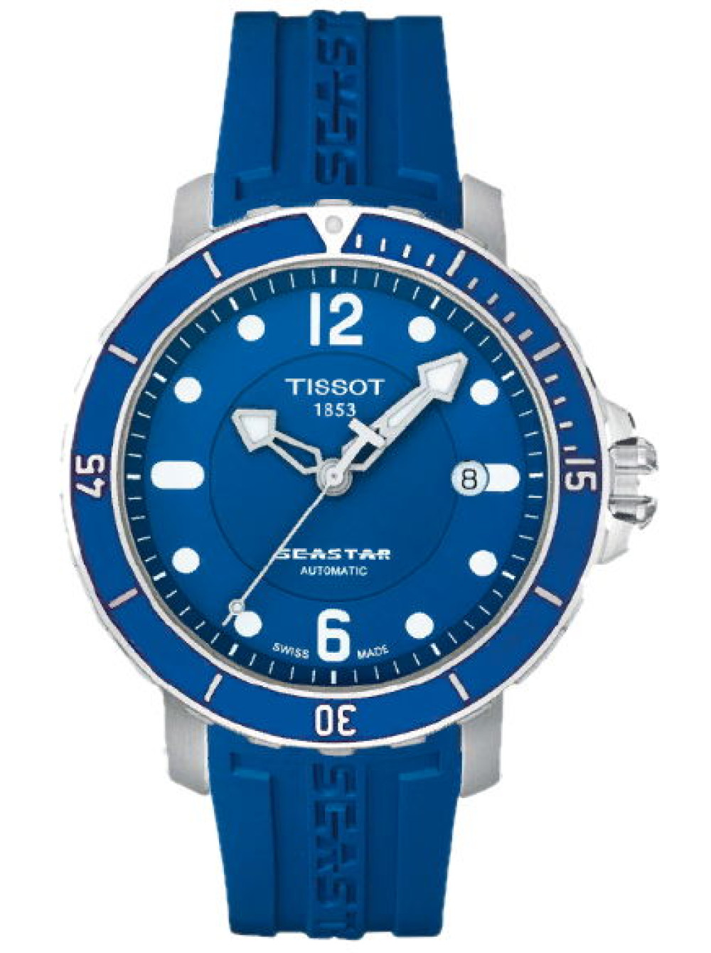 Оригинальный синий, каучуковый ремешок TISSOT, интегрированный под корпус, стальная пряжка. SEASTAR 1000. Размер ремешка входящий в корпус и на пряжку 19/17 мм.
