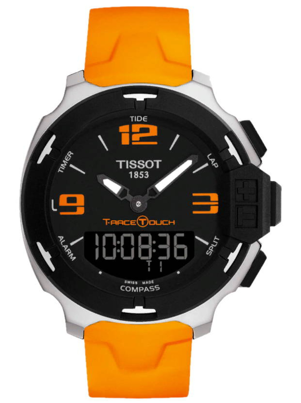 Оригинальный оранжевый, каучуковый ремешок TISSOT, интегрированный под корпус, черная пряжка. T-RACE. Подходит для модели часов T081.420 (на крышке T081420A)