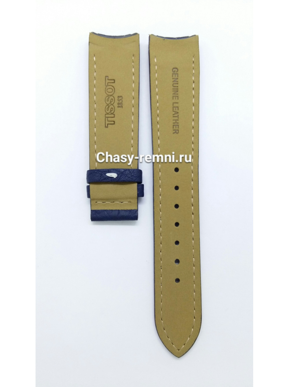 Оригинальный кожаный, синий ремешок TISSOT, интегрированный под корпус, гладкий с белой прострочкой.