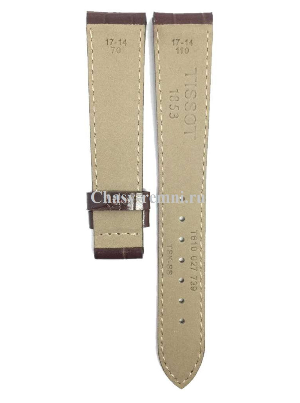 Оригинальный темно-коричневый, кожаный ремешок TISSOT, имитация крокодила, без клипсы. PRC 100. Размер входящий в корпус и на клипсу 17/14 мм. Длина ремешка 70*110 мм.