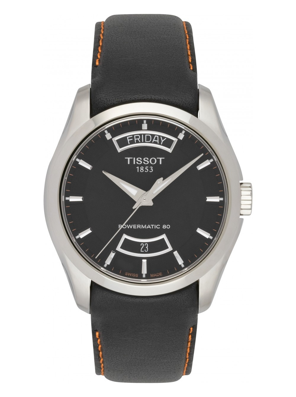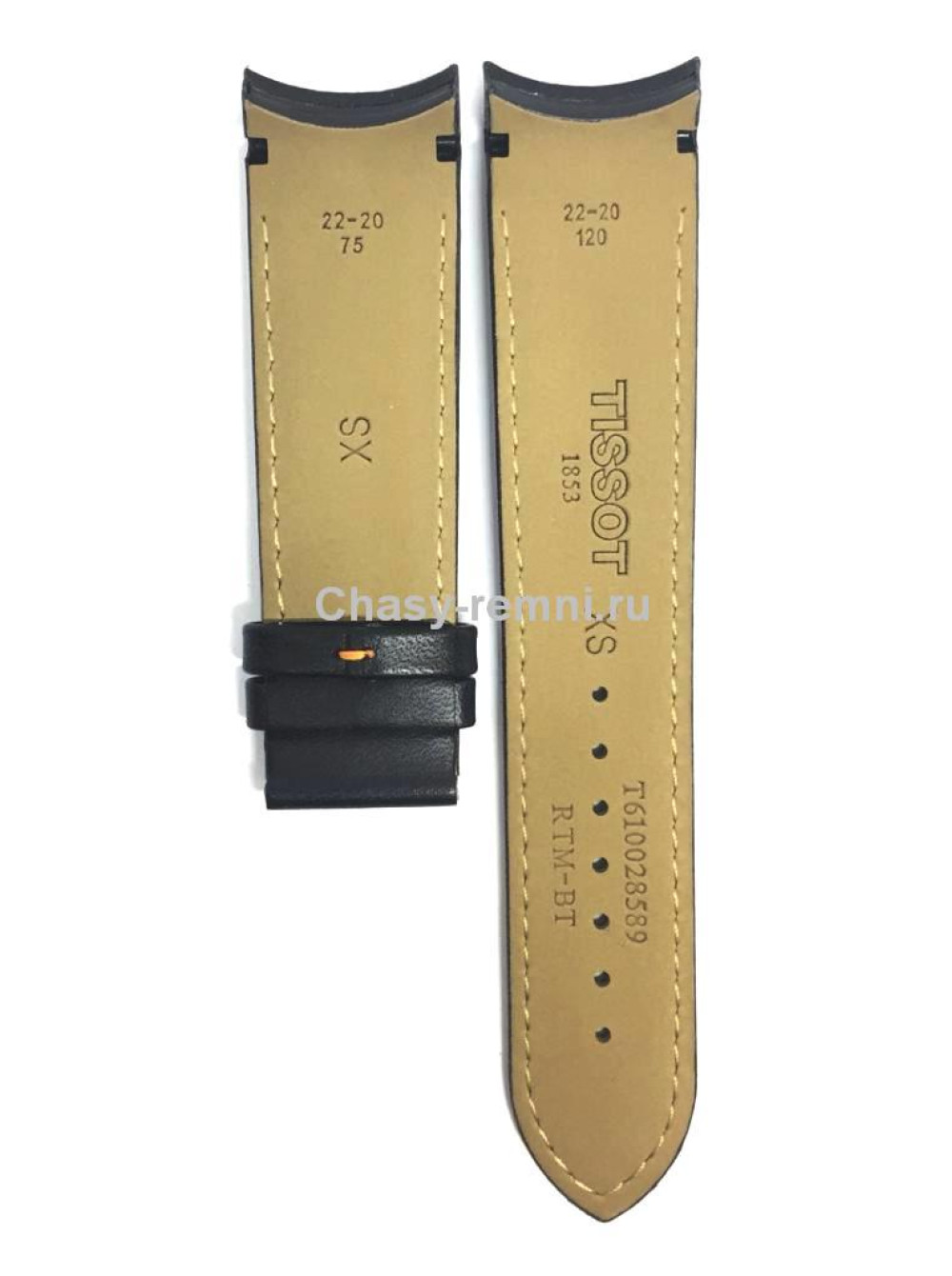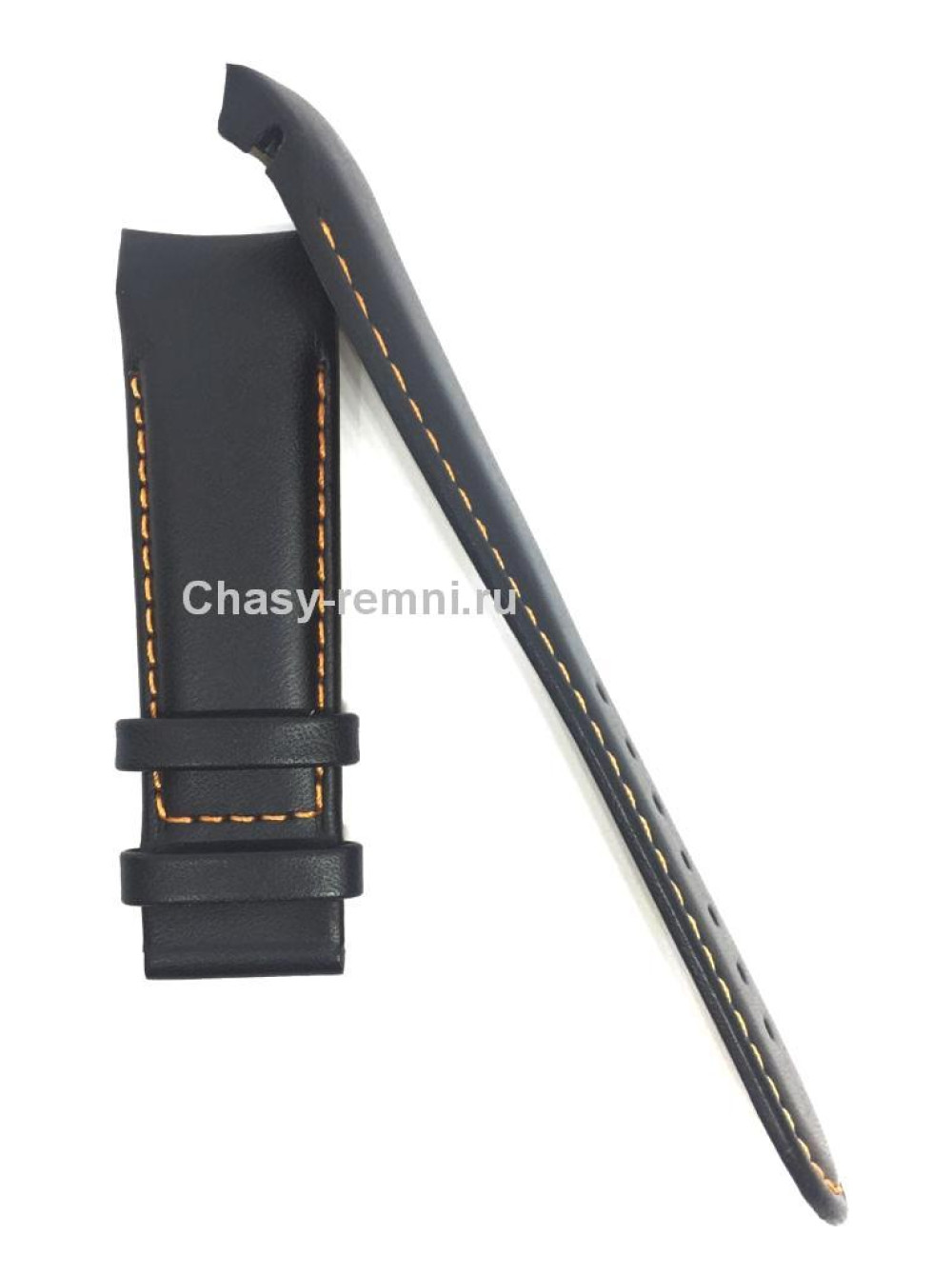 Оригинальный кожаный, черный ремешок TISSOT, интегрированный под корпус, гладкий с оранжевой прострочкой, без клипсы, COUTURIER. Длина ремешка 75*120 мм. Размер входящий в корпус и на клипсу 22/20 мм.