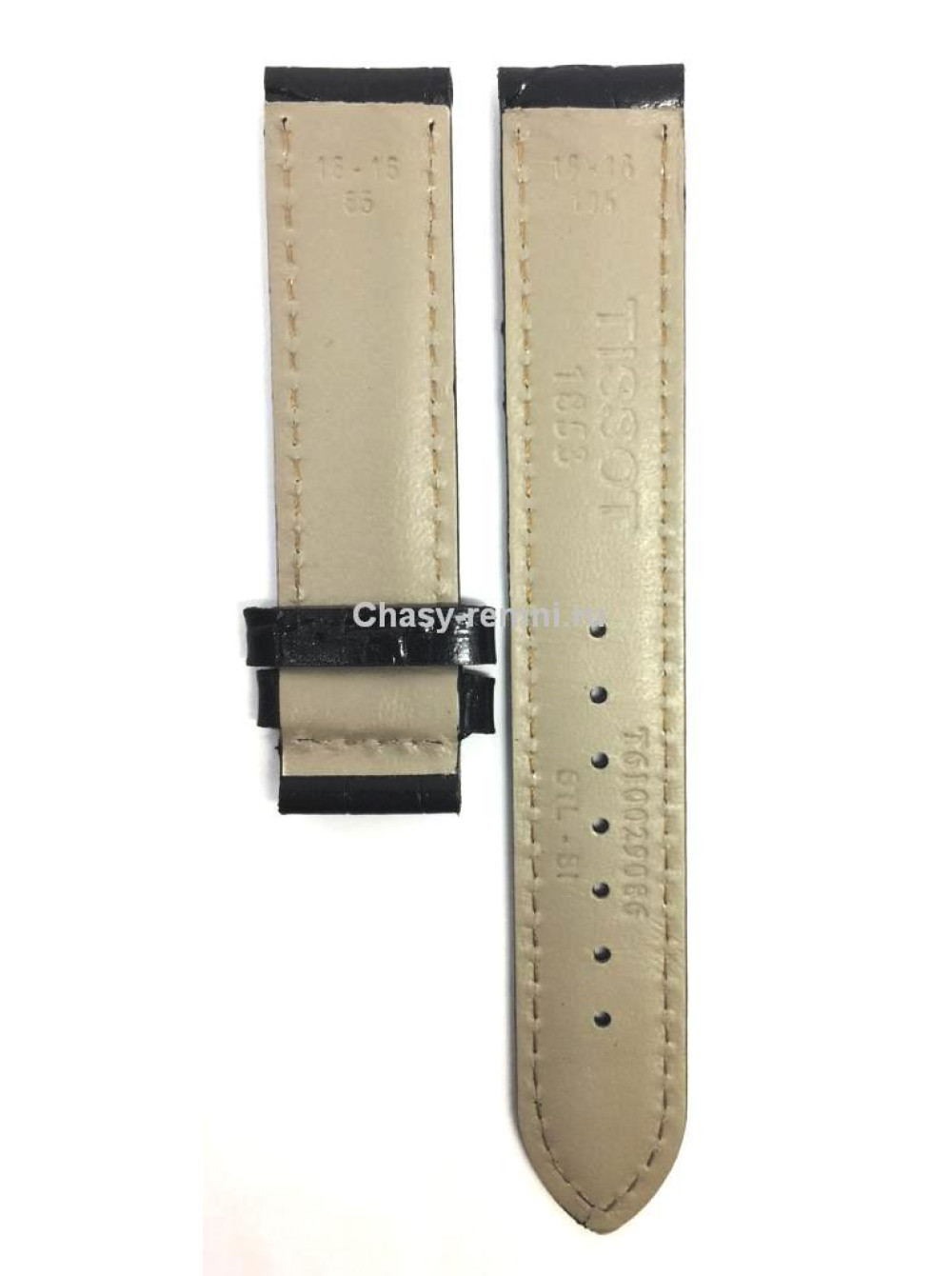 Оригинальный кожаный, черный ремешок TISSOT, имитация крокодила, без клипсы. Размер входящий в корпус и на клипсу 16/16 мм. Длина ремешка 65*105 мм.