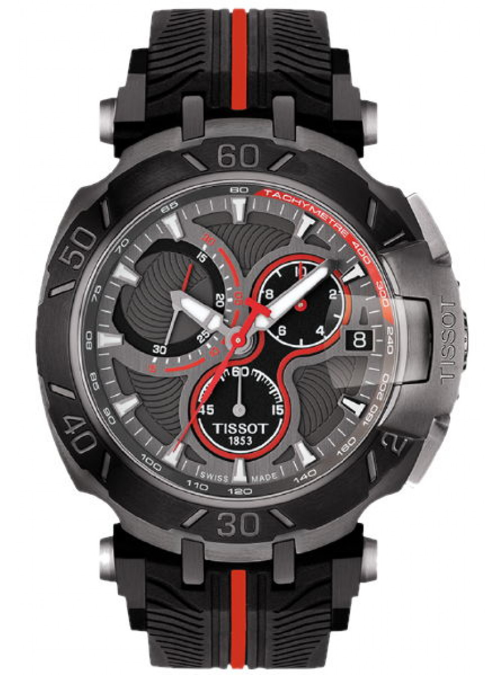 Оригинальный черный с красной полосой по центру, каучуковый ремешок TISSOT, интегрированный под корпус, без клипсы. T-RACE MOTO GP. Размер ремешка входящий в корпус и на клипсу 20/20 мм.