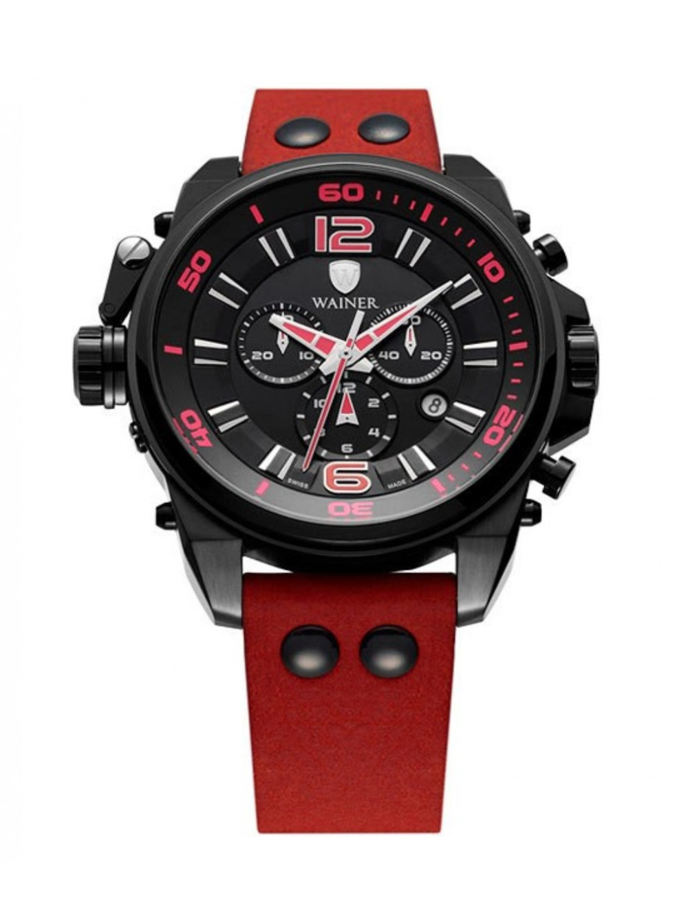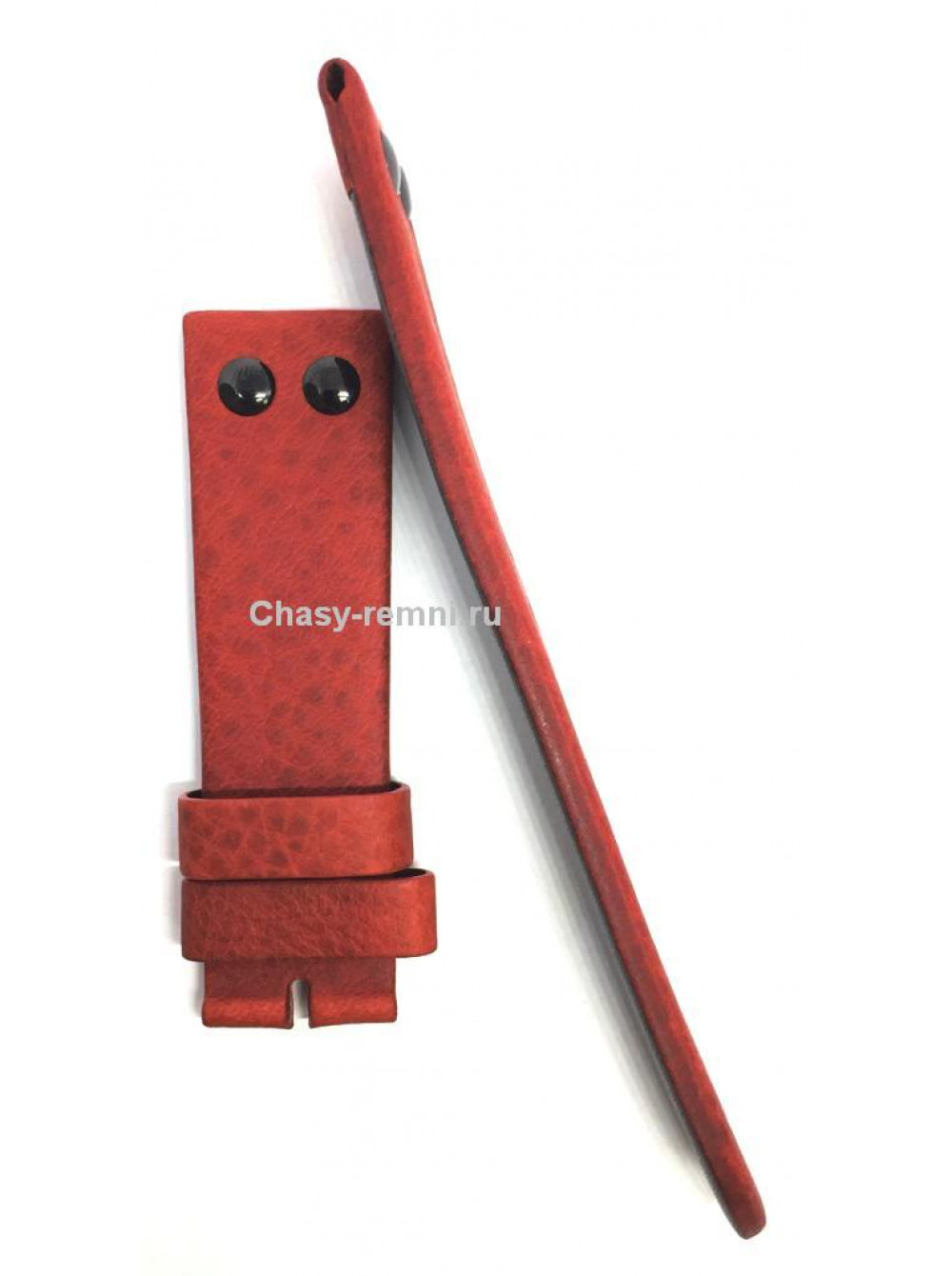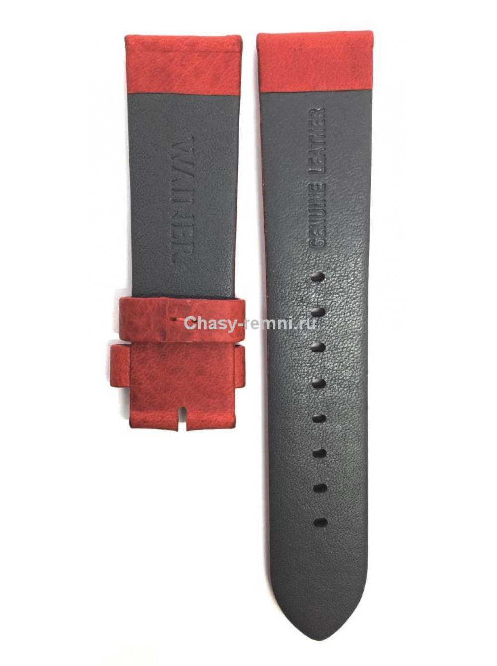 Оригинальный красный, кожаный ремешок WAINER, гладкий с черными заклепками, без пряжки. Размер входящий в корпус и на пряжку 22/20 мм. Длина ремешка 75*120 мм.