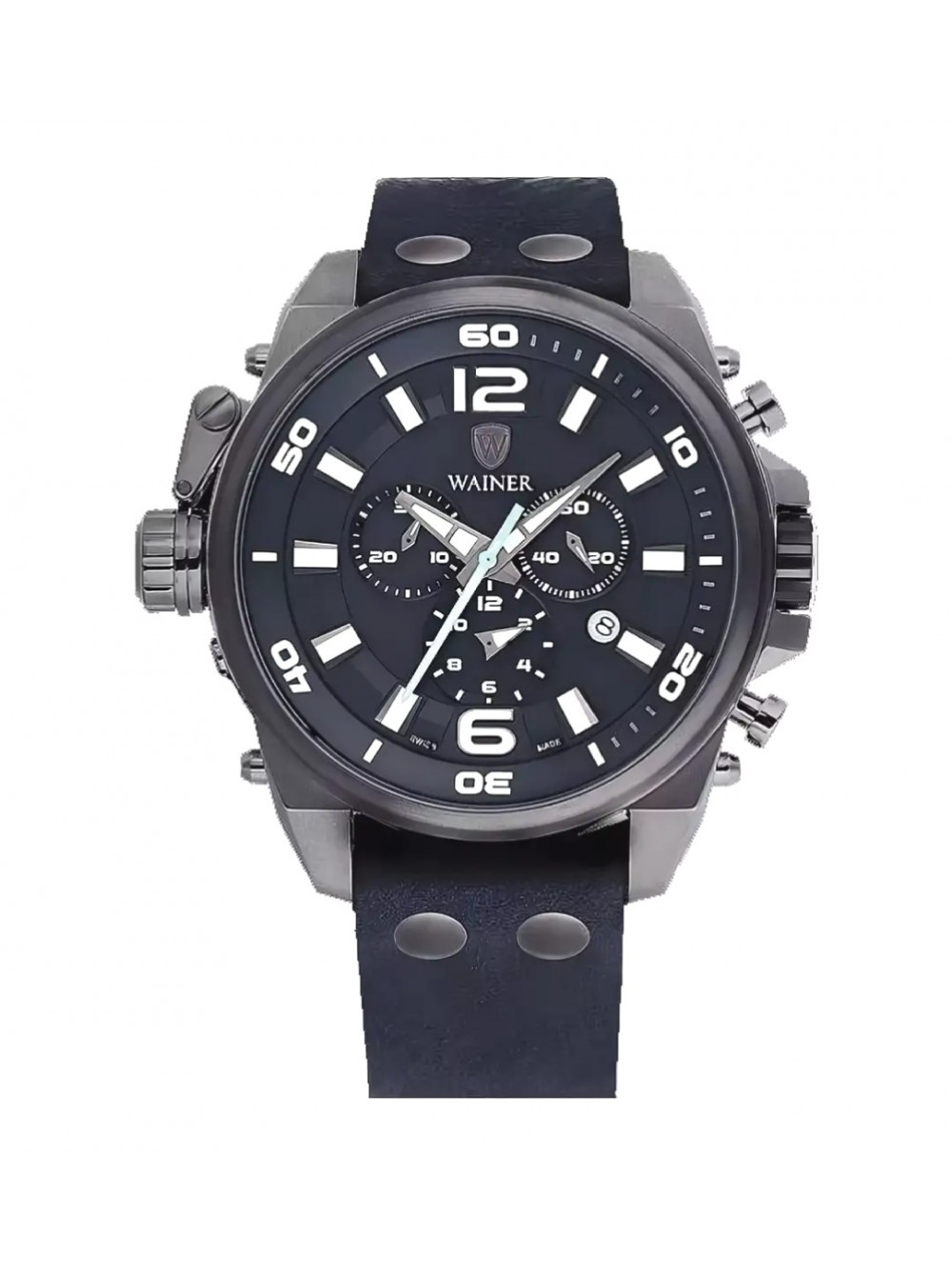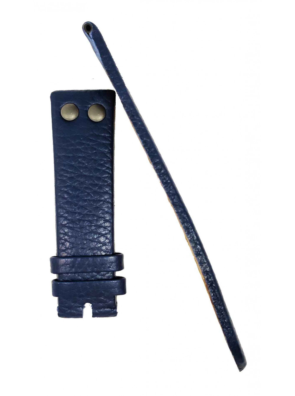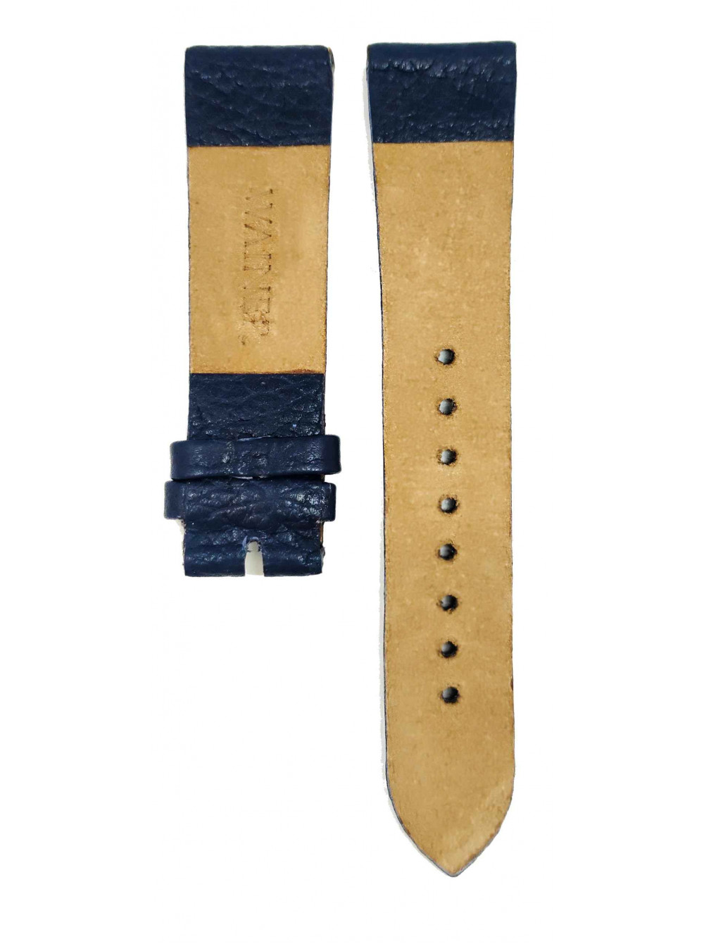 Оригинальный кожаный, синий ремешок WAINER, гладкий, с черными заклепками, без пряжки. Размер входящий в корпус и на пряжку 22/20 мм. Длинна ремешка 75*115 мм.