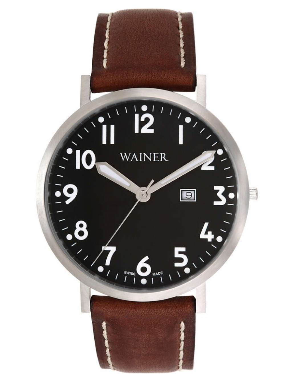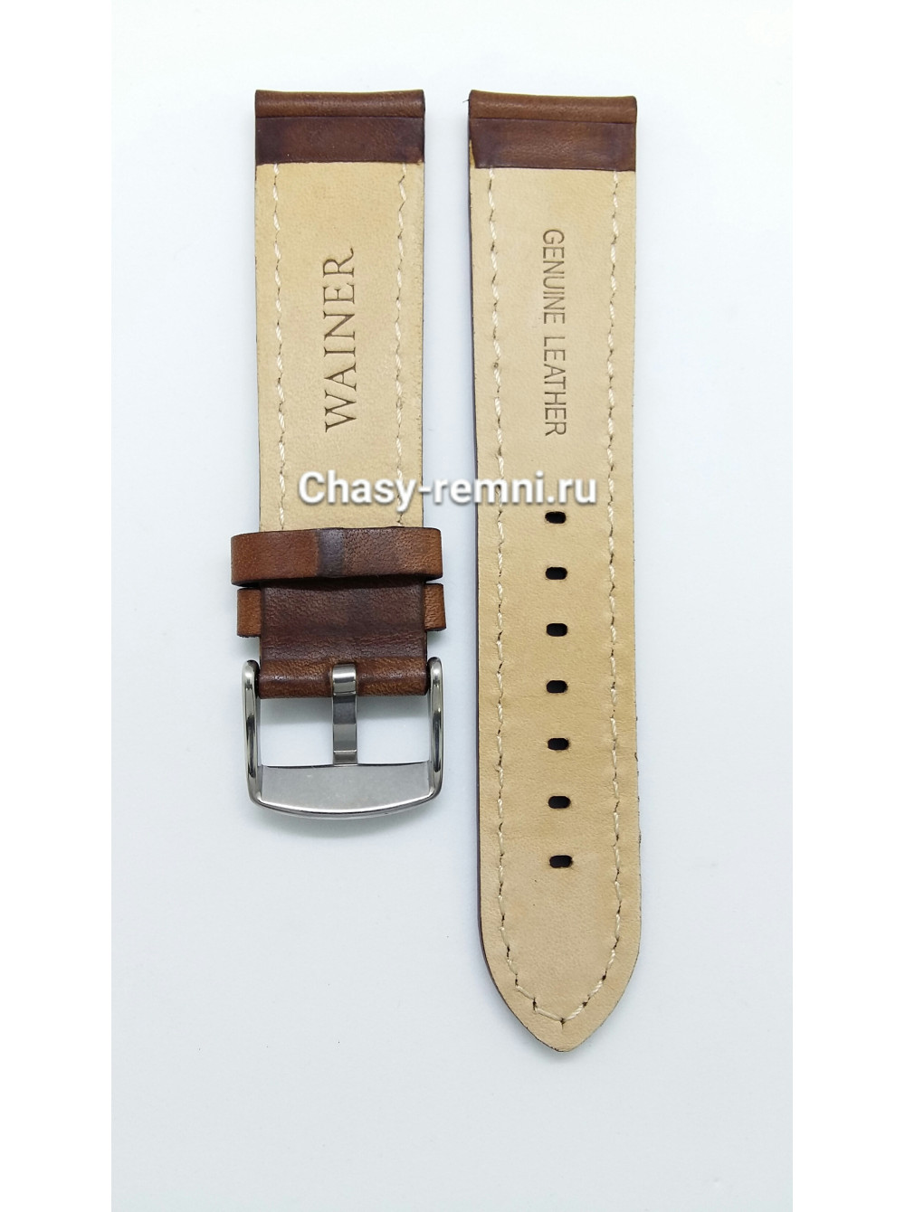 Оригинальный кожаный, коричневый ремешок WAINER, гладкий с белой прострочкой, со стальной пряжкой. Размер входящий в корпус и на пряжку 22/20 мм.