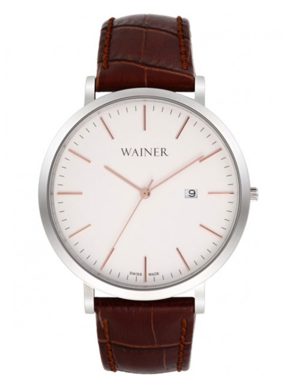 Оригинальный кожаный, темно-коричневый ремешок WAINER, имитация крокодила, стальная пряжка. Размер входящий в корпус и на пряжку 20/18 мм. Длина ремешка 80*125 мм.