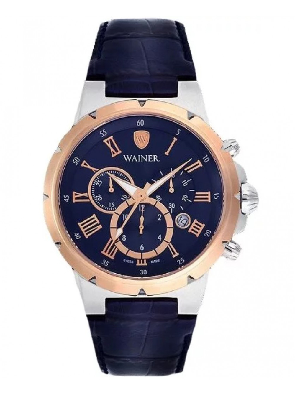 Оригинальный кожаный, темно-синий ремешок WAINER, имитация крокодила, без клипсы. Размер входящий в корпус и на клипсу 16/20 мм. Ширина ремешка 25 мм. Длина ремешка 75*125 мм.