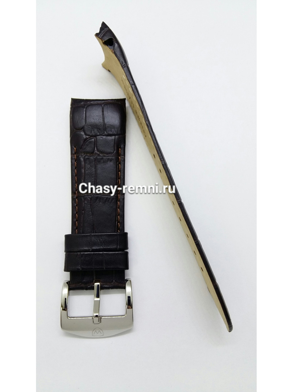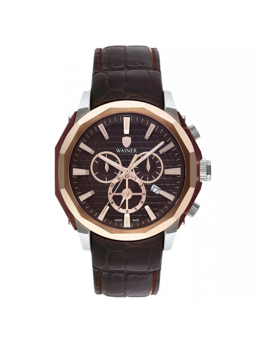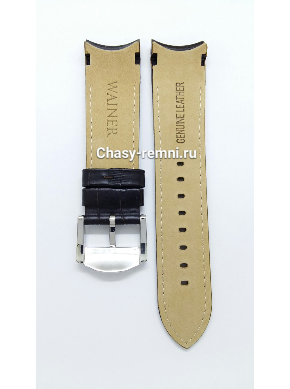 Оригинальный кожаный, темно-коричневый ремешок WAINER, имитация крокодила с коричневой прострочкой, со стальной пряжкой.