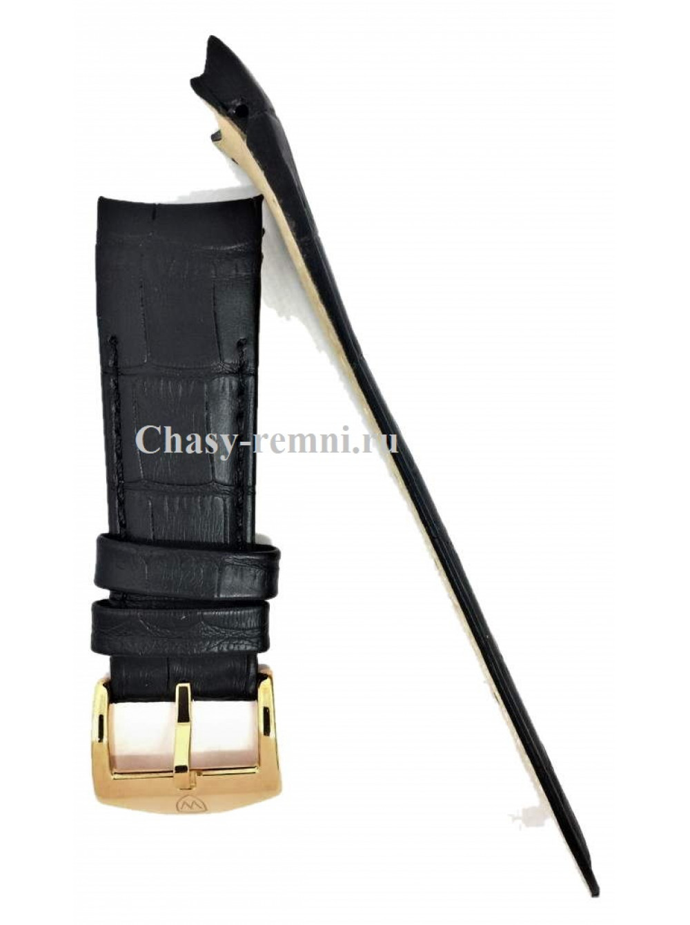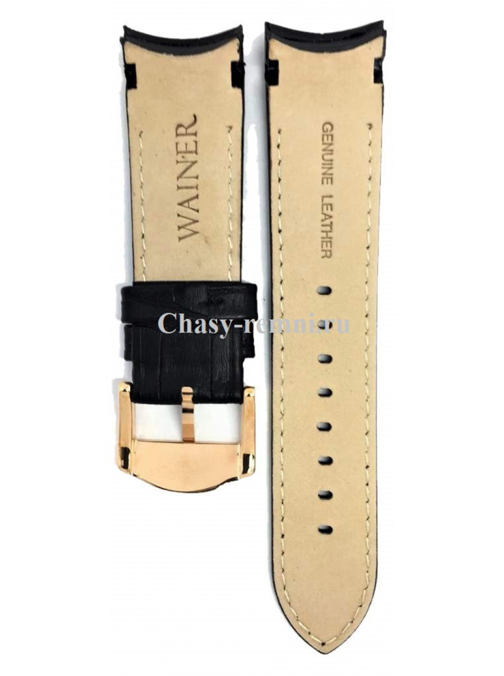 Оригинальный кожаный, черный ремешок WAINER, интегрированный под корпус, имитация крокодила, с розовой пряжкой. Размер входящий в корпус и на пряжку 24/22 мм. Длина ремешка 75*125 мм.