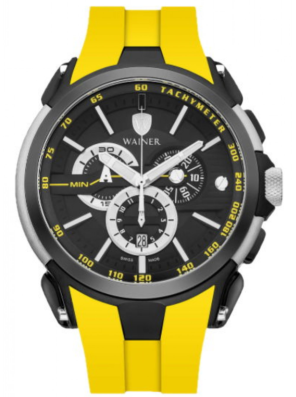 Оригинальный желтый, каучуковый ремешок WAINER, интегрированный под корпус, с черной пряжкой.