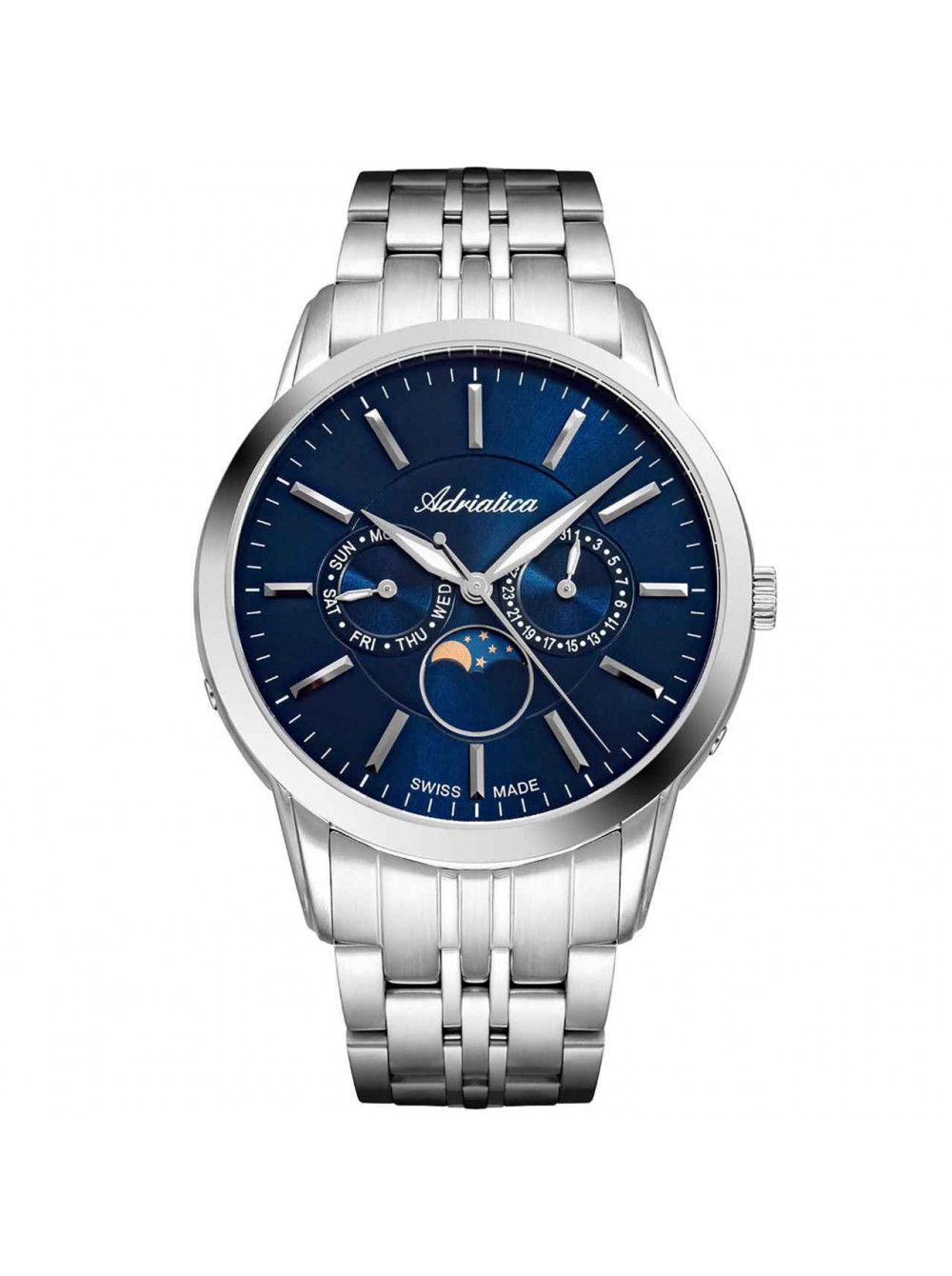 Швейцарские, наручные кварцевые часы ADRIATICA. Корпус из нержавеющей стали. Дата, день недели, индикатор фазы луны, люминесцентные стрелки. Сапфировое стекло. На браслете