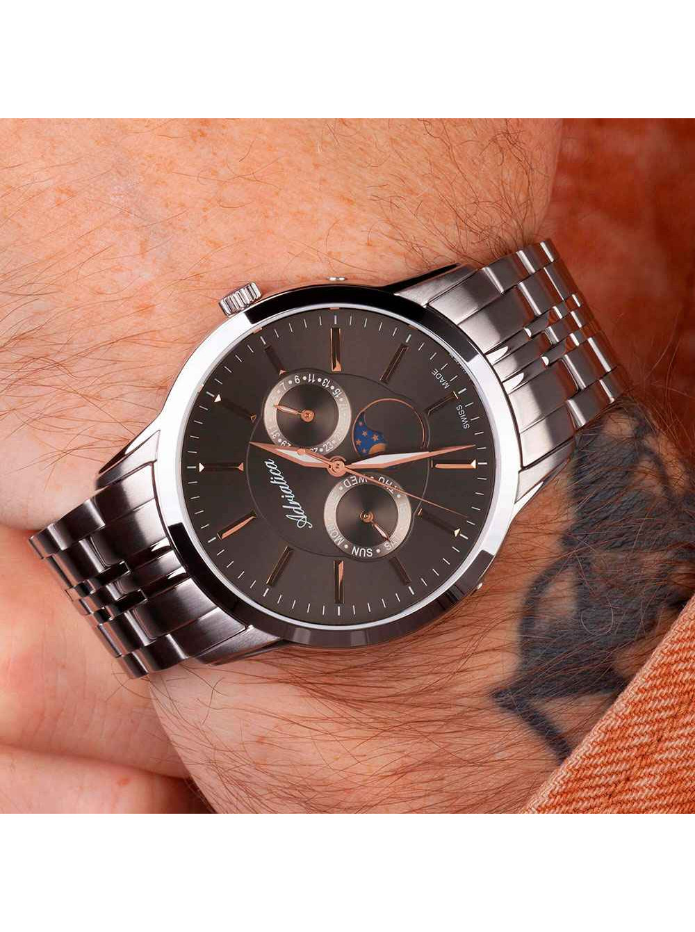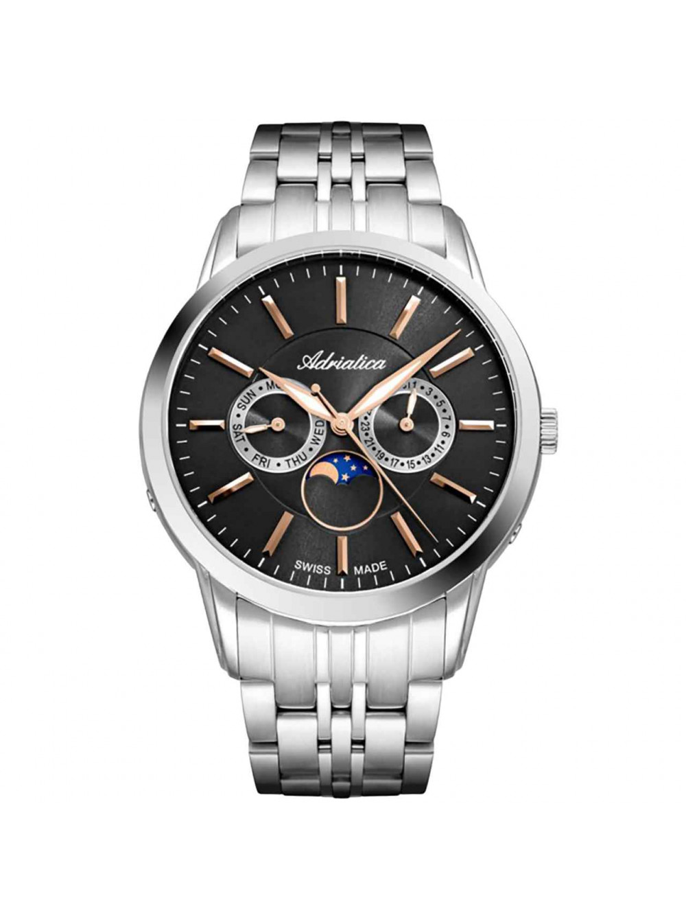 Швейцарские, наручные кварцевые часы ADRIATICA. Корпус из нержавеющей стали. Дата, день недели, индикатор фазы луны. Сапфировое стекло. На браслете