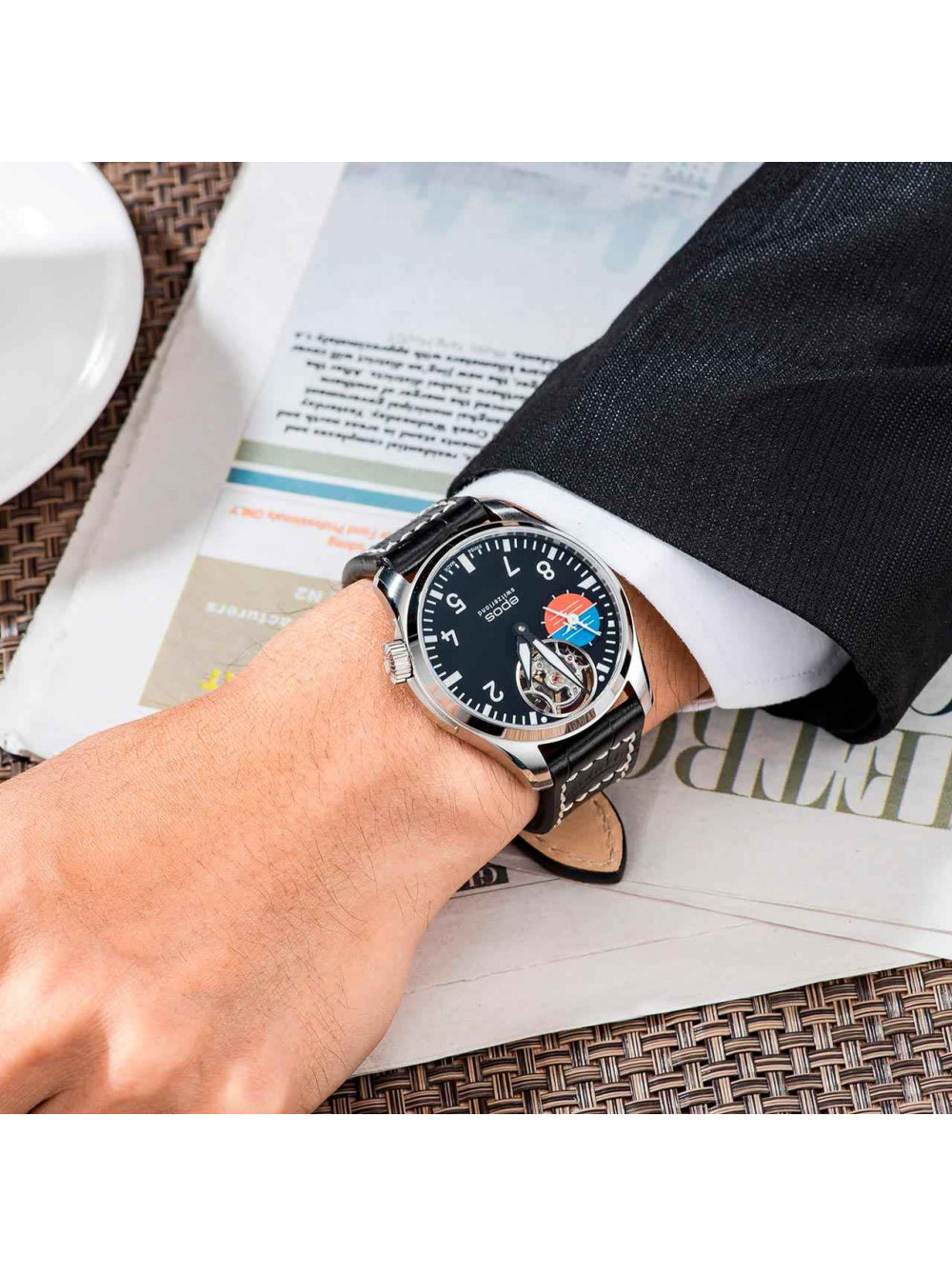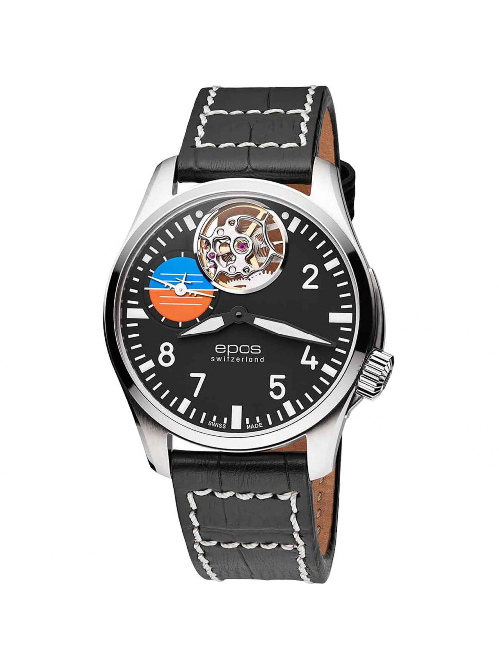 Швейцарские, наручные механические часы EPOS с ручным заводом. Коллекция Sportive Pilot. Вынесенная секундная стрелка, прозрачная задняя крышка, лимитированная стрелка. Корпус из нержавеющей стали. Сапфировое стекло. На ремешке