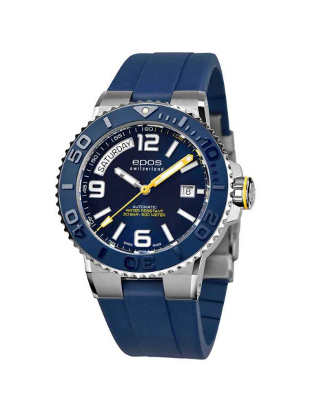 Швейцарские, наручные механические часы EPOS с автоподзаводом. Коллекция Sportive. Прозрачная задняя крышка, люминисцентные стрелки, метки и цифры, керамический безель. Корпус из нержавеющей стали. Сапфировое стекло. На каучуковом ремешке.