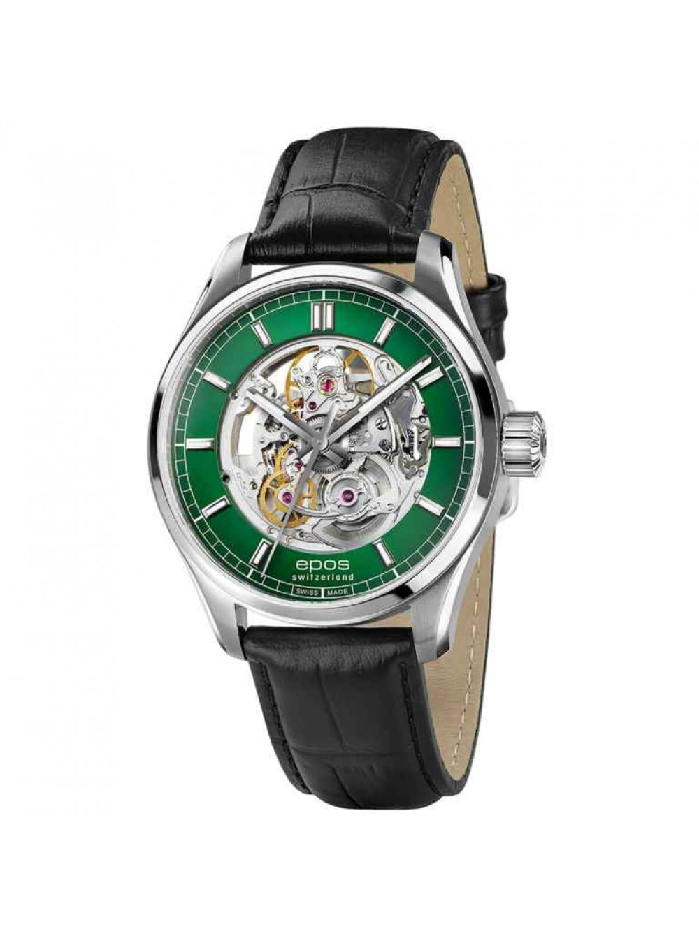 Швейцарские, наручные механические часы EPOS с автоподзаводом. Зеленый циферблат. Коллекция Passion. Скелетон, прозрачная задняя крышка, люминесцентные стрелки и метки. Корпус из нержавеющей стали. Сапфировое стекло. На ремешке.