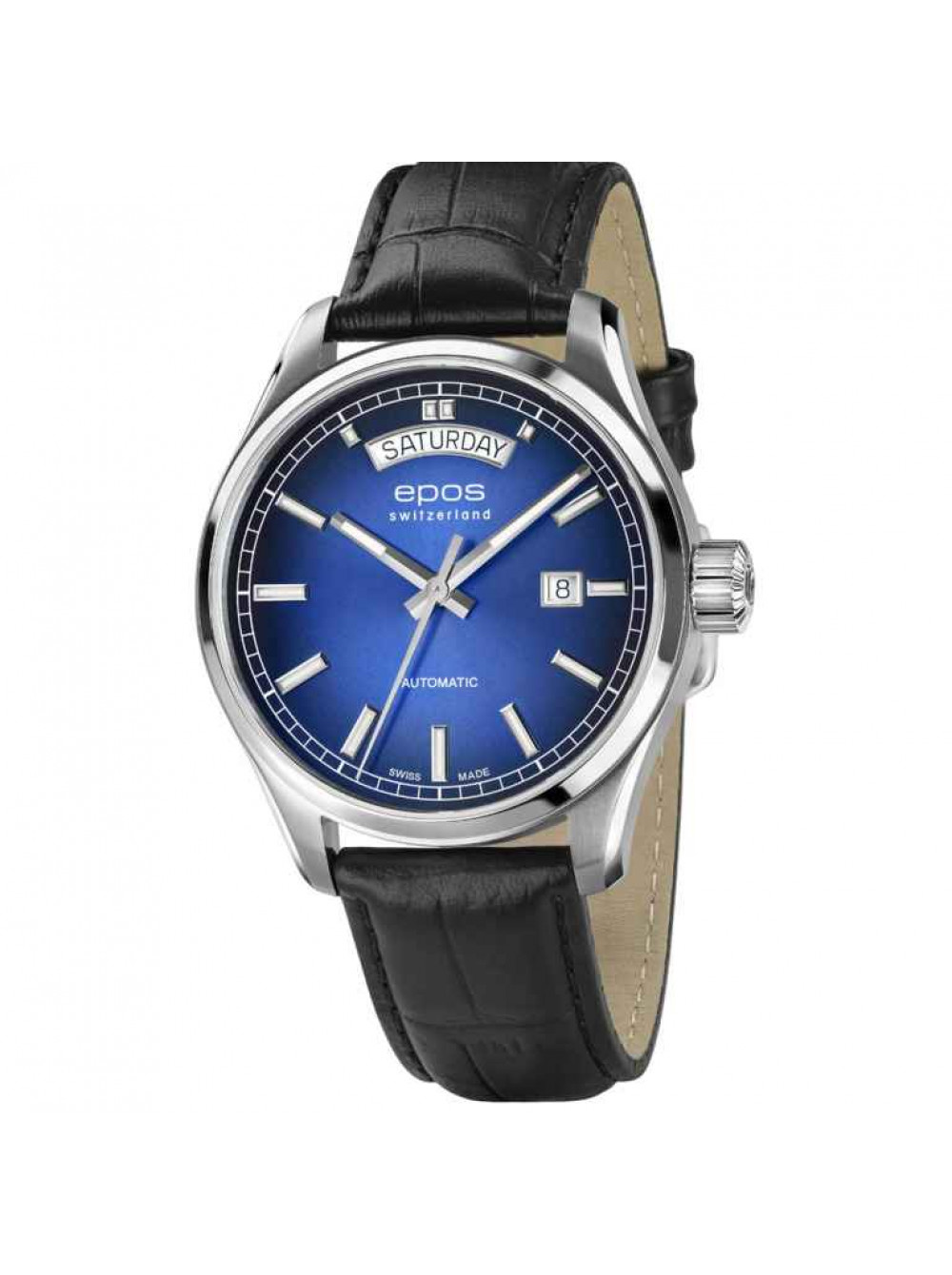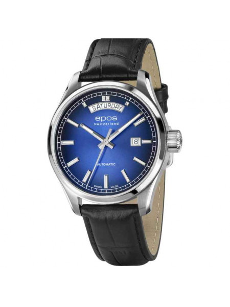 Швейцарские, наручные механические часы EPOS с автоподзаводом. Синий циферблат. Коллекция Passion. Прозрачная задняя крышка, люминесцентные стрелки и метки. Корпус из нержавеющей стали. Сапфировое стекло. На ремешке.