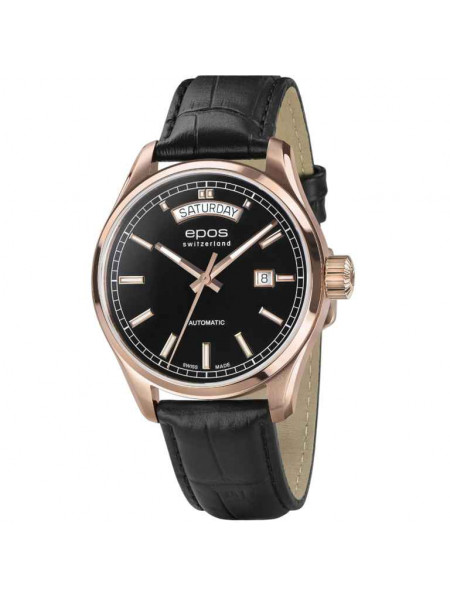 Швейцарские, наручные механические часы EPOS с автоподзаводом. Черный циферблат. Коллекция Passion. Прозрачная задняя крышка, люминесцентные стрелки и метки. Корпус из нержавеющей стали. Сапфировое стекло. На ремешке.