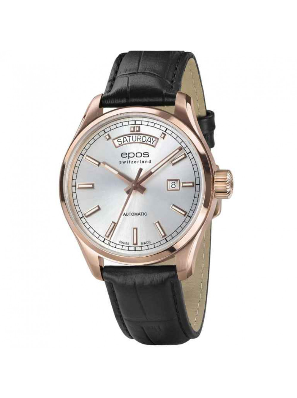 Швейцарские, наручные механические часы EPOS с автоподзаводом. Серебристый циферблат. Коллекция Passion. Прозрачная задняя крышка, люминесцентные стрелки и метки. Корпус из нержавеющей стали. Сапфировое стекло. На ремешке.