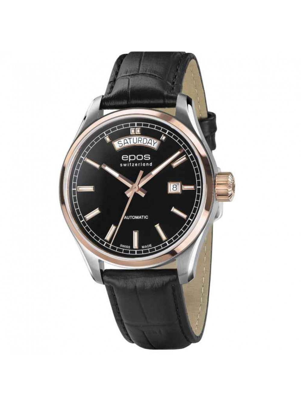 Швейцарские, наручные механические часы EPOS с автоподзаводом. Черный циферблат. Коллекция Passion. Прозрачная задняя крышка, люминесцентные стрелки и метки. Корпус из нержавеющей стали. Сапфировое стекло. На ремешке.