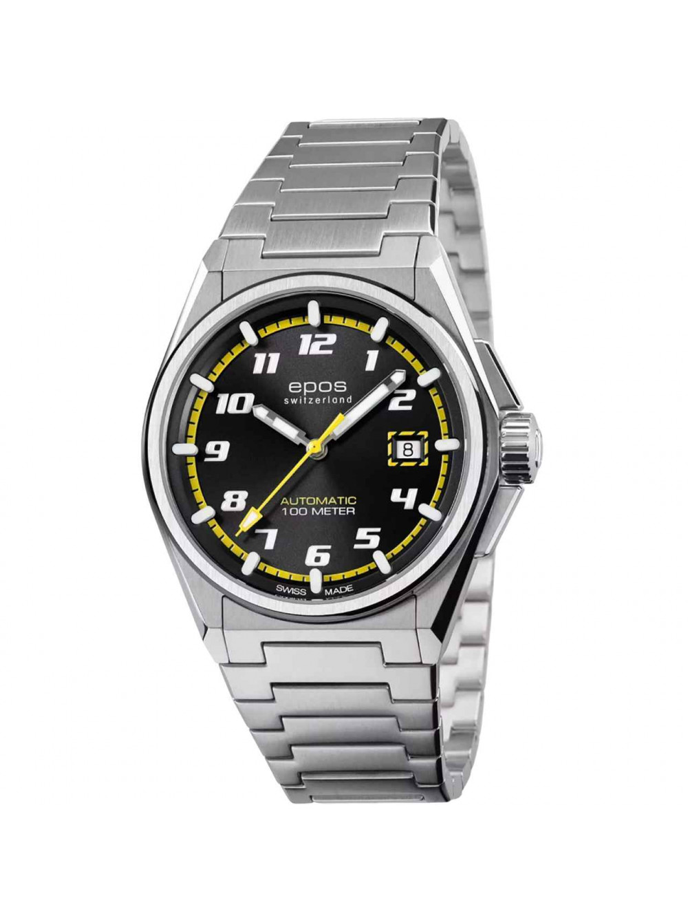 Швейцарские, наручные, механические часы EPOS с автоподзаводом. С черным циферблатом. Прозрачная задняя крышка, люминесцентные стрелки и метки. Корпус из нержавеющей стали. На браслете.