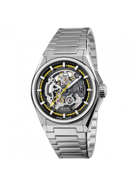 Швейцарские, наручные, механические часы EPOS с автоподзаводом. С черным циферблатом. Прозрачная задняя крышка. Скелетон. Корпус из нержавеющей стали. На браслете.