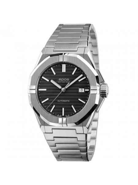 Швейцарские, наручные, механические часы EPOS с автоподзаводом. С черным циферблатом. Прозрачная задняя крышка, люминесцентные стрелки и метки. Корпус из нержавеющей стали. На браслете.