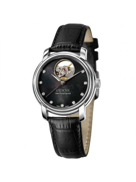 Швейцарские, наручные механические часы EPOS с автоподзаводом. Коллекция Ladies Diamonds. Прозрачная задняя крышка, открытый баланс. Корпус из нержавеющей стали. Сапфировое стекло. На ремешке
