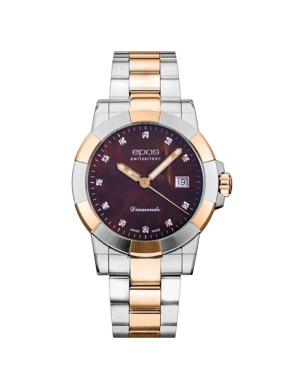 Швейцарские, наручные кварцевые часы EPOS. С датой. Корпус из нержавеющей стали. Сапфировое стекло. На стальном браслете с розовыми вставками