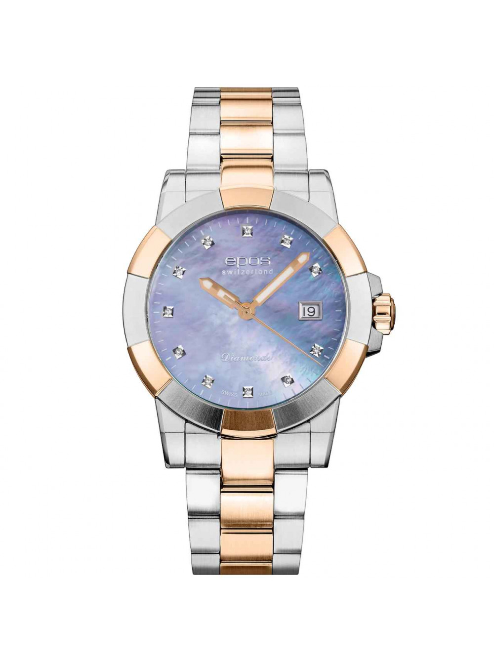 Швейцарские, наручные кварцевые часы EPOS. С датой. Корпус из нержавеющей стали. Сапфировое стекло. На стальном браслете с розовыми вставками