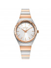 Наручные, кварцевые, женские часы Essence. Стальной корпус с IPG покрытием. Серебристый циферблат. Три стрелки. На комбинированном браслете