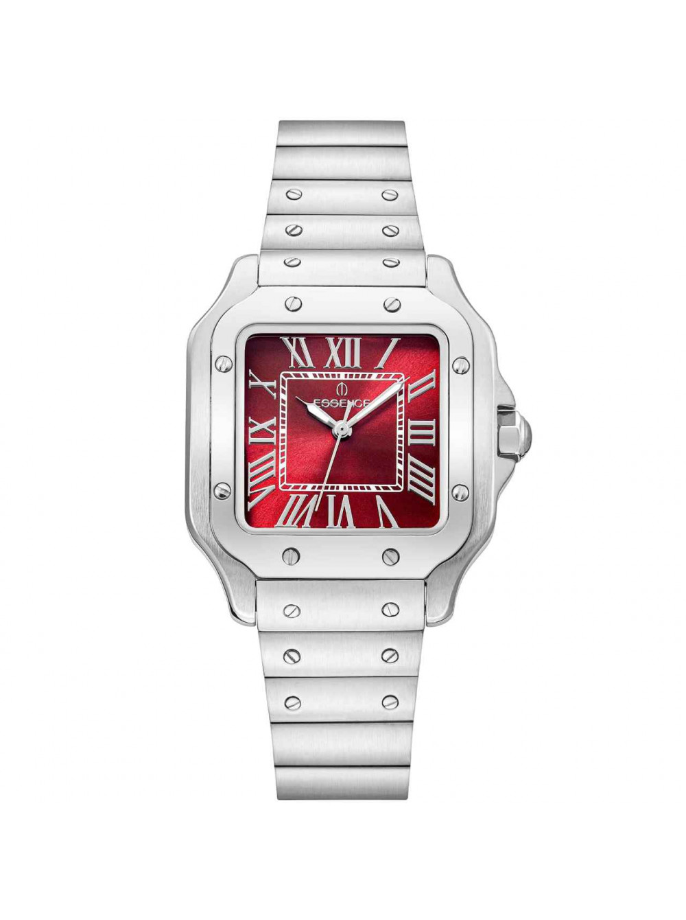 Наручные, кварцевые, женские часы Essence. Стальной корпус. Красный циферблат с римскими цифрами. Три стрелки. На браслете