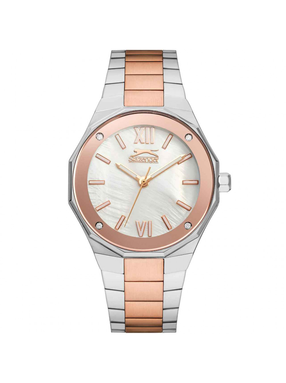 Кварцевые, женские, наручные часы Slazenger. Часы в стальном корпусе, с серым циферблатом. Три стрелки. Минеральное стекло. Часы на стальном браслете с розовыми вставками.