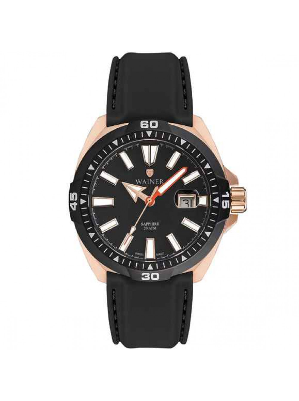 Швейцарские, наручные кварцевые часы WAINER. Черный циферблат. Дата. Корпус из нержавеющей стали. Сапфировое стекло. На ремешке