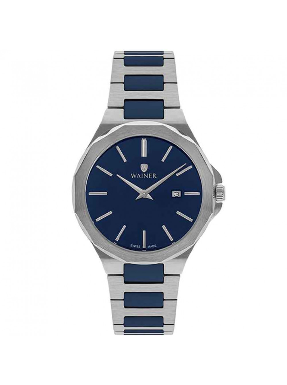 Швейцарские, наручные кварцевые часы WAINER. Синий циферблат. Корпус из нержавеющей стали. Минеральное стекло. На браслете