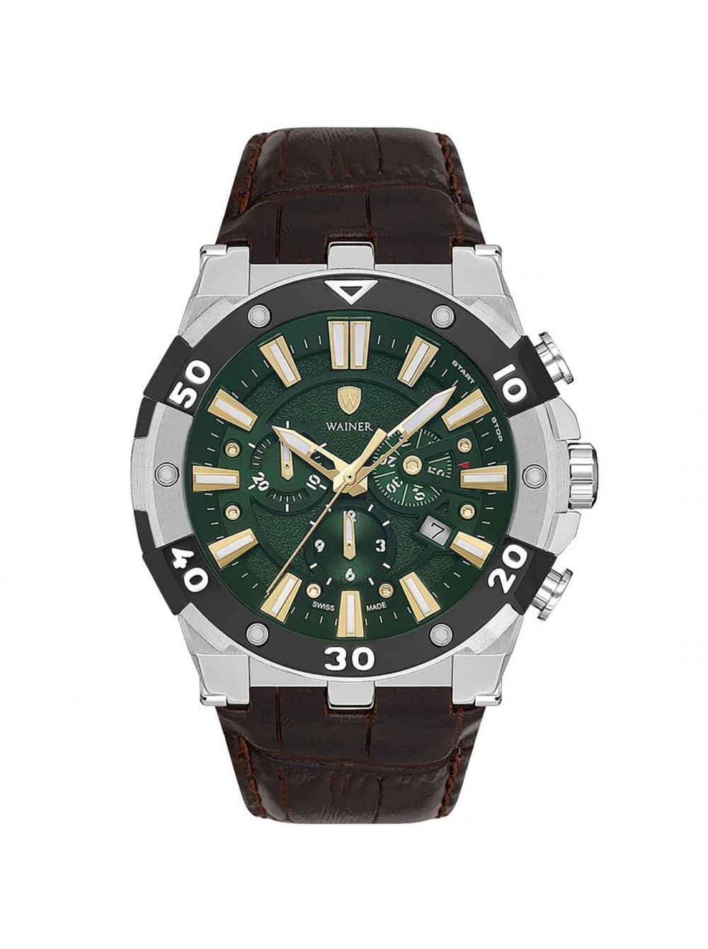 Швейцарские, наручные кварцевые часы WAINER. Корпус из нержавеющей стали. Дата, хронограф, люминесцентные стрелки и метки. Сапфировое стекло. На ремешке.