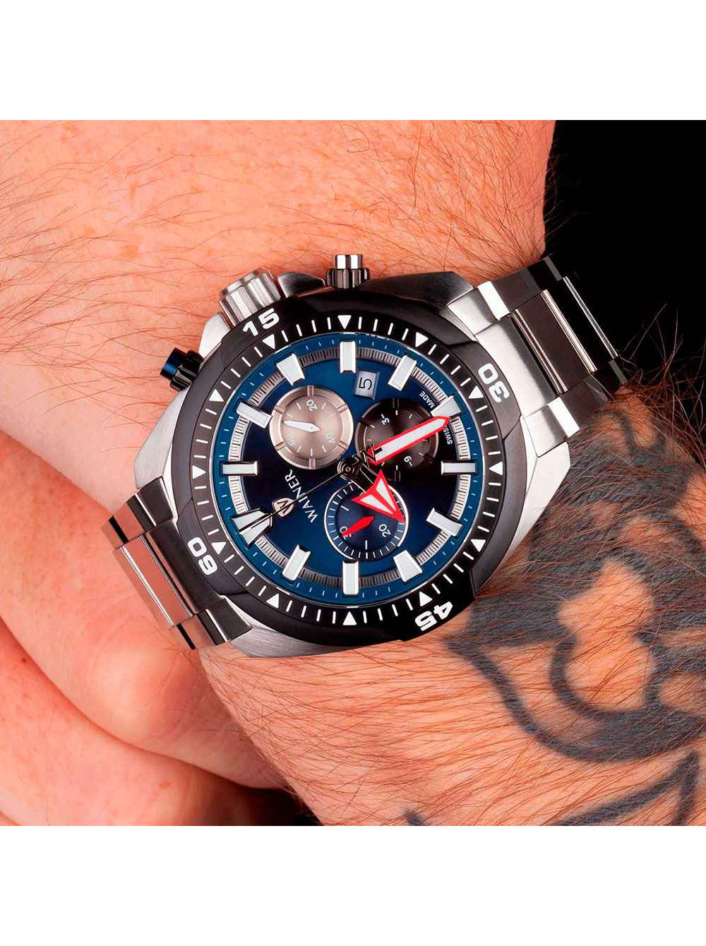 Швейцарские, наручные кварцевые часы WAINER. Корпус из нержавеющей стали. Дата, хронограф, секундомер люминесцентные стрелки и метки. Сапфировое стекло. На браслете.