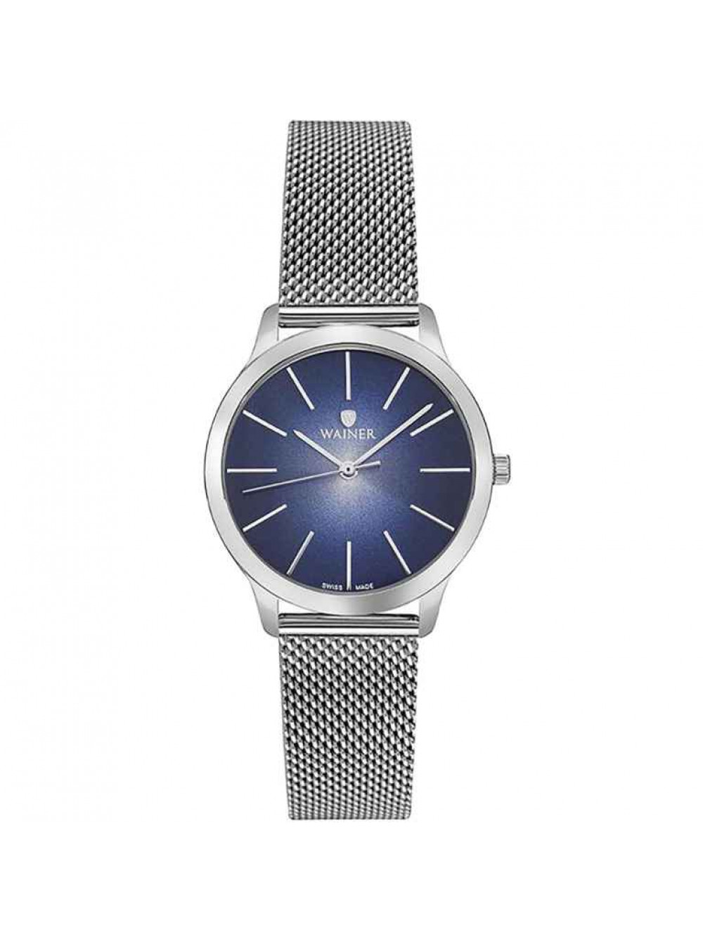 Швейцарские, наручные кварцевые часы WAINER. Синий циферблат. Корпус из нержавеющей стали. Минеральное стекло. На браслете - миланское плетение.