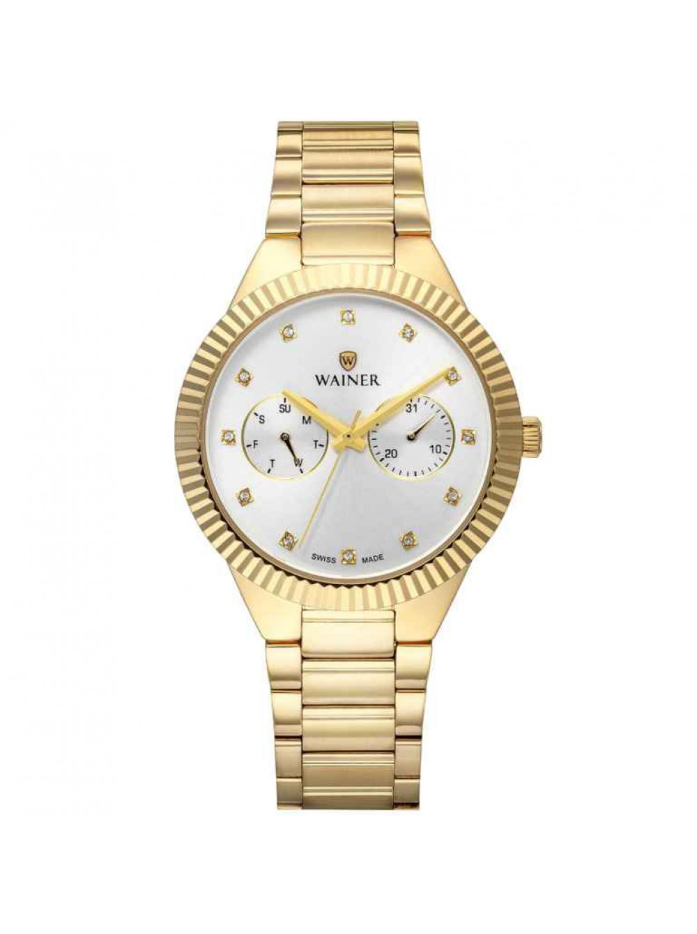 Швейцарские, наручные кварцевые часы WAINER. Серебристый циферблат. Корпус из нержавеющей стали. Минеральное стекло. На браслете.
