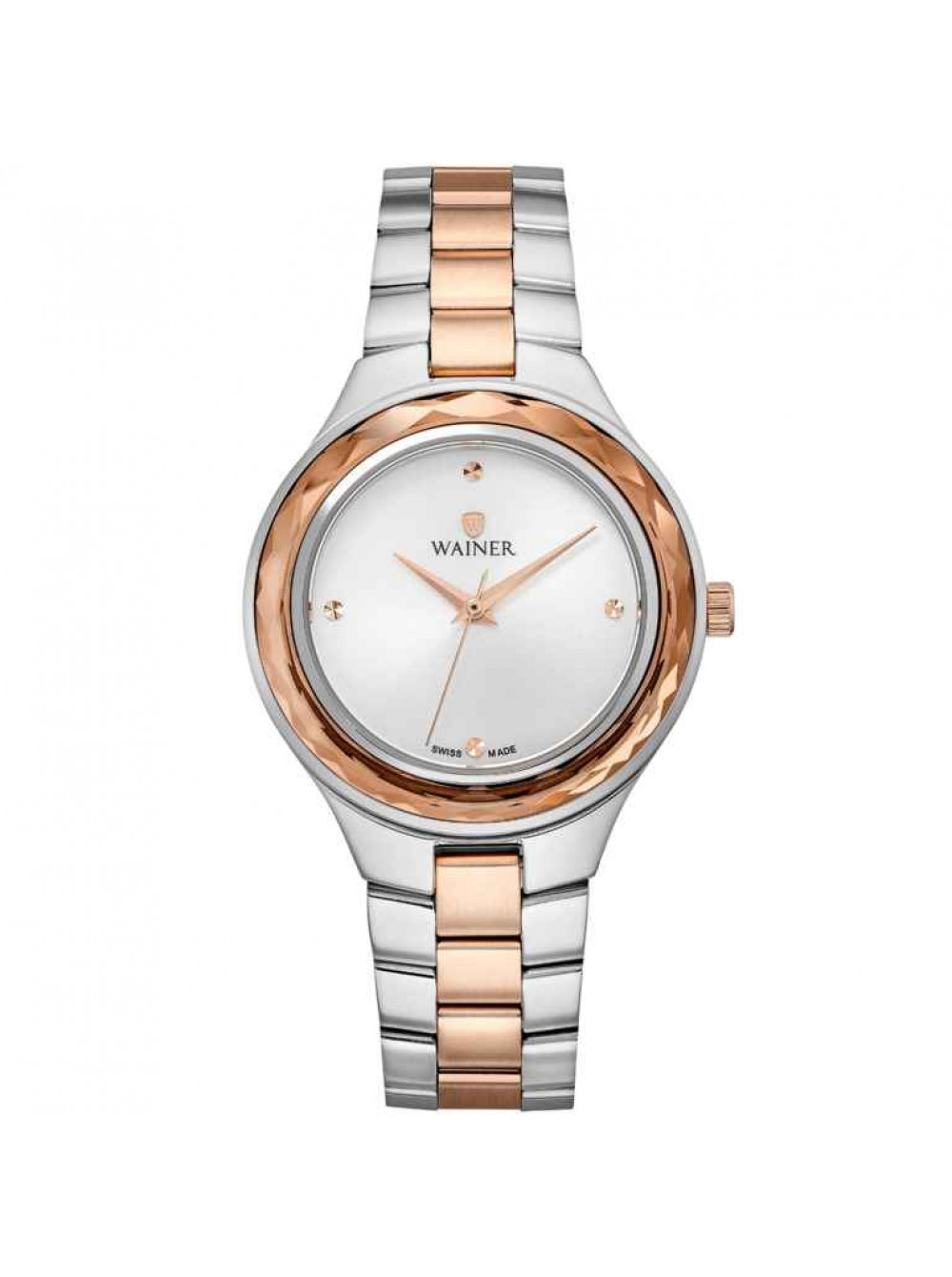 Швейцарские, наручные кварцевые часы WAINER. Серебристый циферблат. Корпус из нержавеющей стали. Минеральное стекло. На браслете.